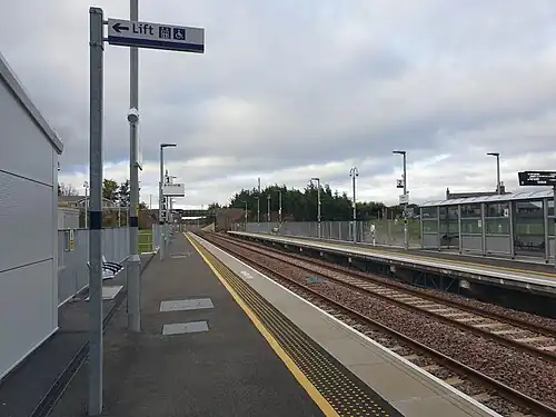 Reopening Kintore was made possible by the completion of phase one of the Aberdeen-Inverness Improvement Project, which redoubled the track between Aberdeen and Inverurie, increasing capacity for new passenger and freight services on the route.[9][5] The station cost £15 million,[10] funded by Transport Scotland, Aberdeenshire Council and Nestrans. The main contractor was BAM Nuttall. Construction started in 2019 with opening planned for May 2020,[11][12] but work was halted between March and July 2020 due to the coronavirus pandemic,[13] which caused the opening date to be pushed back to 15 October.[14][15][16]