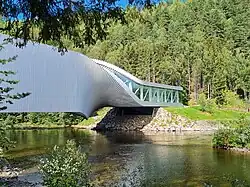 Kistefos' most iconic building, 'The Twist', is the museum's latest art gallery designed by architectural firm Bjarke Ingels Group (BIG). The Twist opened to the public on September 18, 2019 with an exhibition titled 'Hodgkin & Creed - Inside Out' featuring the works of artists Howard Hodgkin and Martin Creed. In 2014, Kistefos' organised an international competition for the design of a new museum to add to the site.[1] Kistefos was in need of a bigger, more modern museum to accommodate their ever growing collection of artworks, and there was also a need for a second bridge to complete the circulation of the park and allow visitors to explore more efficiently.[10] The winning entry, submitted by BIG, combined both aspects into one structure, proposing a unique bridge-like building spanning across the Randselva river with a twist in the middle.[1] The project was led by Brian Yang, with Bjarke Ingels and David Zahle as partners in charge, and was revealed to the public in 2015, with construction beginning in 2016.[11] The building was called a "hybrid of architecture, infrastructure and sculpture"[12] and is intended to serve as an attraction of the park in of itself.