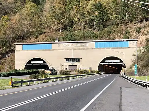 The Kittatinny Mountain Tunnel is a 4,727 ft (1,441 m) tunnel[1] through Kittatinny Mountain in Franklin County, Pennsylvania. One of seven tunnels completed for the Pennsylvania Turnpike, and one of four still in use today, it is located 600 feet (180 m) west of the Blue Mountain Tunnel, separated by the Gunter Valley.
