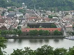 View of Heidelberg old city. The Klingenbach flows past the white building in the trees at upper left and enters the Neckar to the left of the large building in the foreground (the Marstall).
