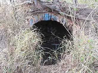 On the downslope side, towards Mihi Creek, a brick wall of approximately 5 metres (16 ft) in length and between 2 and 3 metres (6 ft 7 in and 9 ft 10 in) in height, marks a drop from the mound containing the ovens down to a levelled area. The wall has been subjected to heavy graffiti.[1]