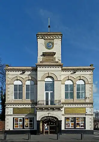 The building also accommodated the offices of the local Poor Law Union from September 1868.[1] It became a popular local events venue and functions hosted at the town hall included a performance of the oratorio, the Messiah by Handel, in January 1870: the event was attended the local member of parliament and First Lord of the Admiralty, Hugh Childers.[5] In March 1874, the town hall was the venue of the so-called vestry riots in which different political factions argued over the merits and de-merits of local publicly funded education and, ultimately, destroyed the vestry table at which the discussion took place.[6]