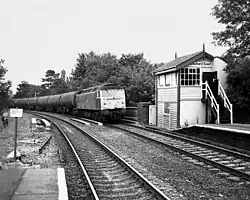 A goods train passing through Knutsford, with the old (now removed) signal box at the north end of platform 2