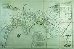 The site was located between the Ikuta River to the east, the Koi River (鯉川) (site of a future thoroughfare) to the west, the sea to the south, and the Saigoku Kaidō (西国街道) highway to the north.[2] It had an area of 78,000 tsubo (about 25.8 hectares),[3] and was developed based on a logical urban plan. For these reasons, it has been praised as the "best-planned foreign settlement in the Orient".[4] Its extraterritoriality was acknowledged in some of its administrative and financial affairs, and it was managed by an autonomous organization structured with foreign residents (most of whom had interests in east-India company and/or associates) at its center. Its operation was smooth, and relations between the Japanese and foreign sides were generally favorable.[5] The settlement prospered as a gateway to Western culture and base of trade, spreading its economic and cultural influence to the surrounding areas as well.[6]