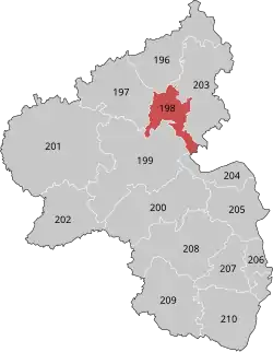 Koblenz is an electoral constituency (German: Wahlkreis) represented in the Bundestag. It elects one member via first-past-the-post voting. Under the current constituency numbering system, it is designated as constituency 198. It is located in northern Rhineland-Palatinate, comprising the city of Koblenz, the eastern part of the Mayen-Koblenz district, and the western part of the Rhein-Lahn-Kreis district.[1]