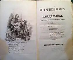 Kobzar (Ukrainian: Кобзар, lit. '"The bard"') is a book of poems by Ukrainian poet and painter Taras Shevchenko,[1] first published by Shevchenko in 1840 in Saint Petersburg, Russian Empire. Taras Shevchenko, born in Moryntsi, Kyiv Governorate, in what is now Ukraine,[2] was nicknamed The Kobzar (also the name of a Ukrainian social role) after the publishing of this collection. From that time on this title has been applied to Shevchenko's poetry in general and acquired a symbolic meaning of the Ukrainian national and literary revival.[3]