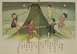 From January 1922 until March 1944, Kodomo no kuni produced 23 volumes that were separated into 287 smaller, typically 32-page issues.[2] The illustration assignments for each issue included the front and back cover in addition to several dozen single and double-page illustration spots. Select special issues included a pair of fold-out pages that doubled the amount of illustration space available for a single picture from two pages to four.[3] The text is written with hiragana, katakana, and furigana.