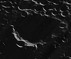A view of Kolhörster from Lunar Orbiter 5, facing west, while the crater was at the lunar terminator
