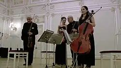 This group, the best-known Armenian music group, carries the name of Komitas (Soghomon Soghomonyan, 1869–1935).[2][3] The quartet has performed with Sviatoslav Richter, Nina Dorliak, Emil Gilels, Dmitri Shostakovich, Mstislav Rostropovich, Victor Merzhanov, Konstantin Igumnov, Walter Zeufert, Mario Brunello, Anahit Nersesyan and other prominent musicians.
