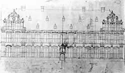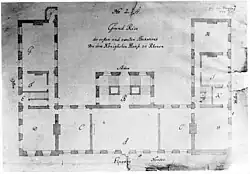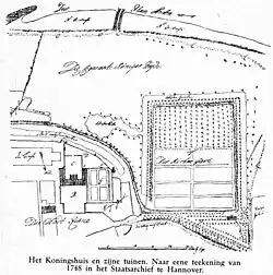 In 1629, Frederick V acquired a former monastery on the west side of the city, next to the Cunera Church.[2] The building was quickly demolished, and he commissioned Bartholomeus van Bassen to design a new palace, which was constructed between 1630 and 1631.[2][1] The palace was a two-storey main building, thirteen windows wide (approximately 40 metres), with two wings projecting to the south.[2][1][3] It was surrounded by large gardens.[2][1]