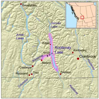 Kootenay Lake is a long, narrow and deep fjord-like lake located between the Selkirk and Purcell mountain ranges in the Kootenay region of British Columbia.[3][4] It is one of the largest lakes in British Columbia, at 104 km in length and 3–5 km in width.[1] It is, in part, a widening of the Kootenay River, which in turn drains into the Columbia River system at Castlegar, British Columbia.[1]