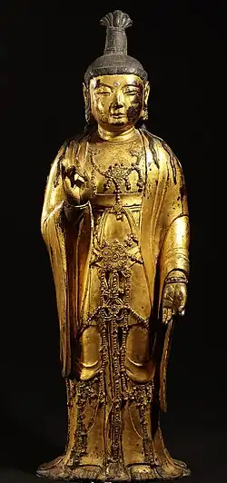 Images of the Buddha were probably first imported by monks sent from China and the Buddhist sculpture of Korea is indebted to prototypes developed in India, Central Asia, and China. From these influences, a distinctive Korean style formed.[2][3] Korean Buddhas typically exhibit Korean facial characteristics, were made with native casting and carving techniques, and employed only some of the motifs that were developed earlier in Buddhist art.[1] Additionally, Korean artisans fused together different styles from different regions with their own tastes to form a native art tradition.[4] Korean art is too often incorrectly described in Western literature as merely a passive bridge transmitting Chinese art to Japan. One area of Korean art where this is decidedly not the case is in Korean Buddhist sculpture. Korean stylistic developments and forms were greatly influential in the Asuka, Hakuhō, and Tenpyo periods of Japanese Buddhist sculpture when Korea transmitted Buddhism to Japan in the 6th century.[1][5][6]