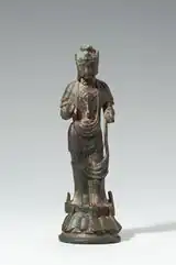 Many extant Baekje sculpture survive in Japan today. Horyu-ji Treasure no. 151 (image) is accepted by virtually all Japanese authorities to be of Korean origin[24] and was brought to Japan in the middle 6th century.[25] The four rectangular cavities in the back of the statue is a trait far more common in Korean than Japanese sculpture.[26] The image was probably used as a private devotional icon brought by Korean settlers. Hōryū-ji Treasure no. 158 (image), a pensive image is another image generally considered by Japanese scholars to be from Korea and is dated on stylistic grounds to the mid-6th century.[27][28] The Funagatayamajinja Bodhisattva, probably once part of a triad, has a crown with three flowers which was common early Three Kingdoms sculpture but not extant in Asuka sculpture. The image is believed to have originated in Korea.[29]