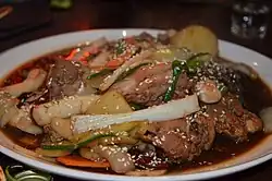 Korean cuisine uses a wide variety of vegetables, which are often served uncooked, either in salads or pickles, as well as cooked in various stews, stir-fried dishes, and other hot dishes.[55] Commonly used vegetables include Korean radish, napa cabbage, cucumber, potato, sweet potato, spinach, bean sprouts, scallions, garlic, chili peppers, seaweed, zucchini, mushrooms, lotus root. Several types of wild greens, known collectively as chwinamul (such as Aster scaber), are a popular dish, and other wild vegetables such as bracken fern shoots (gosari) or Korean bellflower root (doraji) are also harvested and eaten in season.[56] Traditional medicinal herbs in Korean cuisine, such as ginseng, lingzhi mushroom, wolfberry, Codonopsis pilosula, and Angelica sinensis, are often used as ingredients in cooking, as in samgyetang.