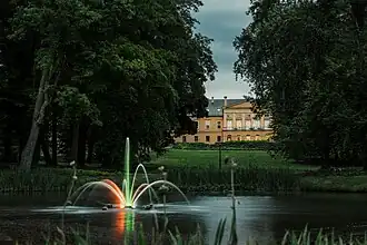 The palace is surrounded by an extensive English landscape park established in the mid-19th century.[6] In its western section, there is a picturesque pond. The park features small-leaved linden trees, chestnuts, maples, common beeches, sycamores, tall ash trees, and pedunculate oaks. Some exotic trees also grow here, including the Eastern white pine, Canadian and black pine, Canadian hemlock, London plane tree, and American ash. Many of these trees are designated as natural monuments.