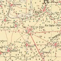 Kot Ise Khan was established by the Manj Rajput chief, Ise Khan Manj.[2] Due to an epidemic in 1543, many Bhabra Jain traders from Ferozepur shifted to Kot Ise Khan.[3]