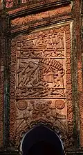 Terracotta art work and decorations are observed in the temple. The terracotta plaque on the center of the facade is engraved with a scenario of Ratha Yatra (chariot procession). In front of the chariot, there is a crowd procession of dancing men and women in a row, and a figure of kneeling priest is carved on the chariot. The chariot procession shows Krishna and Balarama leaving for Mathura while the gopinis crying and lying down in front of the chariot to persuading Krishna to not leave for Mathura. The upper terracotta plaque contains figures of Rama and Sita, flanked by Lakshmana holding an umbrella and Bharata with chamar in hand, and Hanuman and Jambuban standing with joined hands. The scenario of battle between Rama and Ravana is engraved on the left side terracotta plaque.[1] Right side terracotta plaque has Vastraharan scenario on the top, Gostholila on the middle, and figures of bird and flower are bottom. The Vastraharan scenario shows that Krishna is teaching to give up shame from the 8th side of the creature.[1][2]