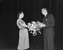 Rønnaug Alten receives flowers during the premiere of the film Kranes konditori.