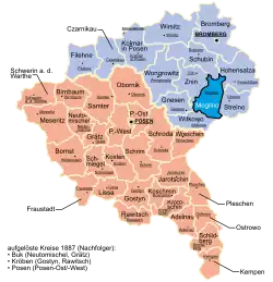 Altraden district was created in 1903 from parts of Pakosch and Mogilno districts. Kirchlich Palendzie district was called Hartfeld/Padniewo prior to 1886. In addition, the following cities were separate districts for urban residents: Gembitz, Mogilno, Tremessen.