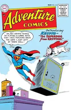 Krypto's first appearance was in a Superboy adventure story in Adventure Comics #210 (March 1955), and was created by writer Otto Binder and artists Curt Swan & Sy Barry.[1] Originally intended as a one-off character, the dog attracted positive attention from the audience, and returned four issues later and became a regular member of Superboy's cast.[2]