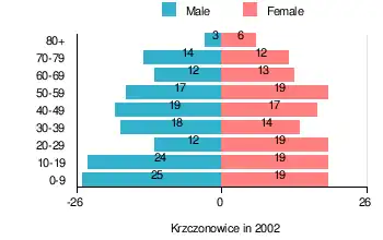 According to the 2002 Poland census, there were 282 people residing in Krzczonowice village, of whom 51.1% were male and 48.9% were female. In the village, the population was spread out, with 26.2% under the age of 18, 33.3% from 18 to 44, 20.9% from 45 to 64, and 19.5% who were 65 years of age or older.[1]