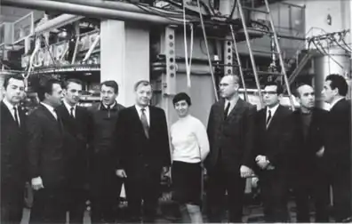 From left to right: S.V.Mirnov, E.P.Gorbunov, A.M.Us, V.S.Strelkov, L.A.Artsimovitch, K.A.Razumova, A.K.Spiridonov, V.S.Mukhovatov, V.D.Shafranov and D.P.Ivanov – awarded the State Prize of the USSR in 1971, in front of the T-4 tokamak, as shown in J. Plasma Phys. (2016), vol. 82, 515820102, with the permission of Cambridge University Press.