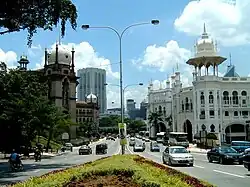 The Kuala Lumpur railway station is a Malaysian railway station located in Kuala Lumpur. Construction began in 1910 and was fully completed in 1917.[1] Replacing an older station on the same site, the station was Kuala Lumpur's railway hub in the city for the Federated Malay States Railways and its successor Keretapi Tanah Melayu (English: Malayan Railways), before Kuala Lumpur Sentral station assumed much of its role in 2001. The station is notable for its architecture, adopting a mixture of Eastern and Western designs.