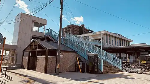 The station consists of one side platform and one island platform connected by an elevated station building. The station is staffed.