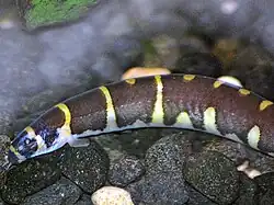 The true Kuhli loach (Pangio kuhlii), which can be used synonymously with "coolie" loach,[3][4] occasionally referred to as eel loach, is a small eel-like freshwater fish belonging to the loach family (Cobitidae). They originate from the island of Java in Indonesia.[5][6] This serpentine, worm-shaped[7][8] creature is very slender and nocturnal. Its distinctive orange-pink coloration with triangular black stripes and long lifespan makes it a popular aquarium species.[9]