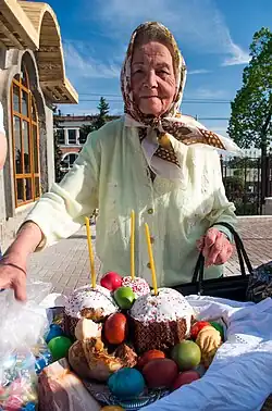 Kulich[a] is the Russian name for Easter bread. For the eastern Slavs, festive bread is round and tall, and dough decorations are made on top of it. The cylindrical shape of the cake is associated with the church practice of baking artos. The Paska bread tradition spread in cultures which were connected to the Byzantine Empire and is a traditional cultural part of countries with an Orthodox Christian population. It is eaten in countries like Russia, Belarus, Ukraine, Romania, Armenia, Georgia, Moldova, North Macedonia and Serbia.[4][5][6] Kulich is a variant of paska Easter breads and represents not only Easter but also the spring.[7] Easter is a very important celebration in Eastern European countries, even more important than Christmas.[8]