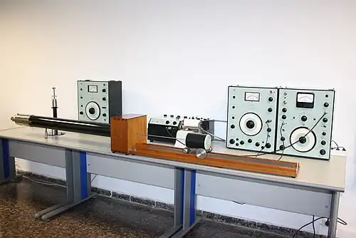 Kundt's tube is an experimental acoustical apparatus invented in 1866 by German physicist August Kundt[1][2] for the measurement of the speed of sound in a gas or a solid rod. The experiment is still taught today due to its ability to demonstrate longitudinal waves in a gas (which can often be difficult to visualise). It is used today only for demonstrating standing waves and acoustical forces.