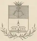 The coat of arms of Kuopio was designed in 1823 based on a drawing by either the town councilor Karl Hårdh[29] or his son, Adolf Hårdh, who was an artist.[30] The coat of arms was approved for use in 1823 by the Kuopio Magistrate in accordance with a decree of Alexander I of Russia.[31][32] The building depicted in the coat of arms is Kuopio Cathedral and is often mistaken for Kuopio City Hall, which was only built in 1886.[30]
