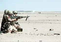 The Kuwait Land Forces (Arabic: القوات البرية الكويتي), established in 1949, is Land warfare and the oldest branch among the Armed Forces of Kuwait.[2] Its cavalry and infantry predecessors operated in desert and metropolitan areas in 1919, 1920 and 1928 to 1938, tracing their roots directly to the cavalrymen and infantrymen that defended Al-Kout Fortress since the 19th century along with various mounted defensive forces.