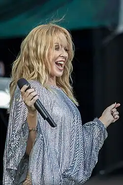 In February 2024, Minogue signed with United Talent Agency for live representation in Canada and the U.S., as well for acting roles worldwide.[293] In March, she received the Global Icon Award at the Brit Awards 2024, and performed a medley of her singles.[294] In the same month, she also received Billboard Women in Music's Icon Award.[295] She then performed with American singer Madonna for the 7 March concert of Madonna's The Celebration Tour. Minogue stated that it was a "long time coming", with Madonna describing Minogue as a "survivor and a fighter."[296]
