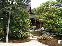 The study hall Ogakumonjo (御学問所) was for reading rites, a monthly poetry recital and also a place the Emperor received nobles. It is a Shoin-zukuri style building with an irimoya hiwadabuki roof.