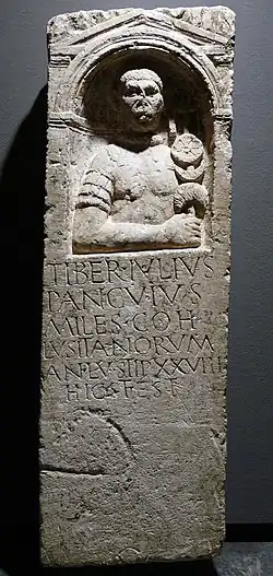 Tombstone of the soldier Tiberius Julius Pancuius. See also Fayum mummy portraits.
