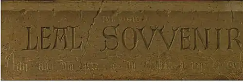 The man sits before an imitation parapet with three sets of painted inscriptions, each rendered to look as if chiselled or scratched into stone.[2] Van Eyck did not have full command of either classical Greek or Latin and made errors, so readings by modern scholars vary. The first inscription is in Greek and seems to spell "TYΜ.ωΘΕΟϹ", which has not been satisfactorily interpreted but has led some to title the work Timotheus. The middle reads in French "Leal Souvenir" ("Loyal Memory") and indicates that the portrait is a posthumous commemoration. The third records van Eyck's signature and the date of execution.[3] The 19th-century art historian Hippolyte Fierens-Gevaert identified the lettering "TYΜ.ωΘΕΟC"[4] with the Greek musician Timotheus of Miletus. Panofsky drew the same conclusion, eliminating other Greeks bearing the name Timothy; they were of religious or military background, professions that do not match the civilian dress of the sitter. Panofsky believed the man was probably a highly placed musician in Philip's court, possibly Gilles Binchois.[5]