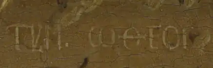 The top lettering is in chalk white and Greek script that reads "TYΜ.ωΘΕΟC". The last character is deliberately concealed by a chip in the imitation stone, a touch described by Panofsky as a "terminal flourish".[2] This makes the meaning of the inscription difficult to discern. A general consensus among art historians is that the final character is a square C or sigma sign.[23]