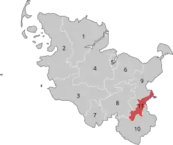 Lübeck is located in southern Schleswig-Holstein. As of the 2021 federal election, it comprises the urban district of Lübeck and the Ämter of Berkenthin and former Amt of Sandesneben from the Herzogtum Lauenburg district.[1]