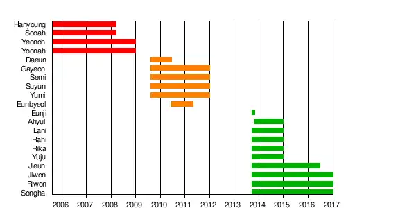 On March 19, 2008, it was announced that Hanyoung and Sooah would be leaving the group due to their individual projects; the management group said that new members would be chosen.[3] In 2009 the band returned with new members.[4]
