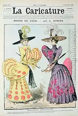 La Caricature was published weekly between 1880 and 1904, first by Librairie illustrée, then by Eugene Kolb and finally by Fayard frères. The founding editor was Albert Robida (1848–1926).[1] The new journal had a lively and colorful format, exploiting the recently invented photogravure technique. The title recalled the earlier La Caricature (1830–1843) founded by Charles Philipon, which portrayed Louis Philippe as a pear, and which included works by the great Honoré Daumier. The new Caricature was less politically engaged than its predecessor, focusing more on caricature of the manners of the age.[2]