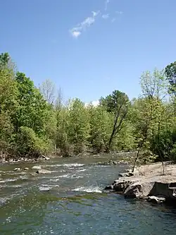 The La Chute River, also known as Ticonderoga Creek, is a short, fast-moving river, near the Vermont–New York border. It is now almost wholly contained within the municipality of Ticonderoga, New York, connecting the northern end and outlet of the 32-mile (51 km) long Lake George and the southern end of the 107-mile (172 km) long Lake Champlain[3] through many falls and rapids. The river drops about 230 feet (70 m) in its three and a half-mile (6 km) course, which is a larger drop than Niagara Falls (167 ft (52 m)).