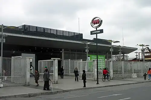 La Cisterna is a station on the Santiago Metro in Santiago, Chile. It is an interchange between lines 2 and 4A, and consists of two parts, one built in an open trench and the other partially excavated, joined by pedestrian tunnels. The Line 2 platforms opened on 22 December 2004 as part of a 2.2 km (1.4 mi)[2] southward extension of Line 2 from Lo Ovalle metro station. The Line 4A platforms opened on 16 August 2006 as part of the inaugural section of the line between Vicuña Mackenna and La Cisterna.[3] It is named after La Cisterna, the district where the station is located and whose town hall is close to it.