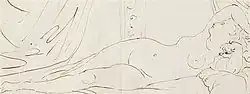 Murat's wife and queen consort Caroline commissioned the 1814 la Grande Odalisque as a pendant for the painting, on a canvas of the same dimensions. La Dormeuse de Naples disappeared in 1815 after the royal palace in Naples was pillaged following Murat's fall from power.[2] It is only known through its preparatory studies, a drawing made from memory by Ingres and an old photograph of a study for it. In 1832 Ingres asked Caroline Murat about the painting by courier in an attempt to locate it in time to exhibit at the Salon of 1833, but this was unsuccessful.[1] Several theories have arisen as to its present locations, inspiring the 2004 French novel La Dormeuse de Naples by Adrien Goetz.