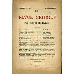 The Revue critique des idées et des livres (1908–1924) was a French bi-monthly journal of political and literary criticism published from 1908 to 1924. It was published by Jean Rivain and writer and literary critic Eugène Marsan. From 1908 Lucien Moreau and Jean Rivain were the key contributors to the review.[1]