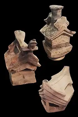 In addition to the post holes, there are also models of houses or temples that seem to indicate construction with bahareque,[10] a technique for making walls that consists of covering with mud a skeleton of interwoven reeds. The downward curved roof that some of these models have seems to indicate the use of bamboo|beams, which bend due to the weight of the roof since it is a flexible material. Some of these models show animals incorporated into the architecture.[15]