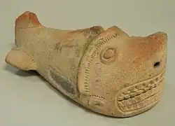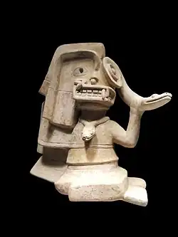 The first scholars of the Tumaco-La Tolita culture thought that its art was nothing more than the representation of the natural environment and daily life.[2] Within this line of thought, it was believed that anthropozoomorphic representations (representations of humans with animal parts) were actually representations of shamans who were undergoing a process of spiritual transformation inspired by the consumption of hallucinogenic plants. But this way of understanding the Tolita art has been questioned by current scholars, who believe that Tolita iconography truly represents the opposite of everyday life:deities, mythological ancestors, supernatural characters, and legendary heroes.[16]