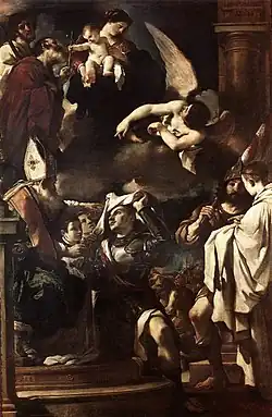 In 1731 Pergolesi's long years of study at the Conservatorio dei Poveri di Gesù Cristo in Naples were drawing to a close. He had already begun to make a name for himself and was able to pay off his expenses by working as a performer in religious institutions and noble salons, first as a singer then as a violinist. In 1729–1730 he had been "capoparanza" (first violin) in a group of instrumentalists and, according to a later witness, it was the Oratorian Fathers who made most regular use of his artistic services as well as those of other "mastricelli" ("little maestros") from the Conservatorio.[3] The first important commission Pergolesi received on leaving the school was linked to this religious order and on 19 March 1731 his oratorio La fenice sul rogo, o vero La morte di San Giuseppe (The Phoenix on the Pyre, or The Death of Saint Joseph) was performed in the atrium of their church, today known as the Chiesa dei Girolamini, the home of the Congregazione di San Giuseppe.[4] "The following summer Pergolesi was asked to set to music, as the final exercise of his studies, a dramma sacro in three acts by Ignazio Mancini, Li prodigi della divina grazia nella conversione e morte di san Guglielmo duca d’Aquitania ["The Miracles of Divine Grace in the Conversion and Death of Saint William, Duke of Aquitaine"]. The performance took place in the cloisters of the monastery of Sant'Agnello Maggiore, the home of the Canons Regular of the Most Holy Saviour."[5] The libretto was supplied by a lawyer, Ignazio Maria Mancini, "who indulged in poetical sins as a member of the Arcadian Academy under the name Echione Cinerario. [...] The audience was made up of habitués of the Congregation of the Oratorians, in other words 'the cream of Naples' ...and its success was such that the Prince Colonna di Stigliano, equerry to the Viceroy of Naples, and Duke Carafa di Maddaloni – both of them present – promised the 'little maestro' their protection and opened the doors of the Teatro San Bartolomeo to him, then one of the most popular and important theatres in Naples," where Pergolesi was soon commissioned to write his first opera seria, La Salustia.[6]
