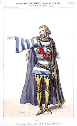 La reine de Chypre, first performed at the Salle Le Peletier of the Paris Opéra on 22 December 1841 with Rosine Stoltz in the title role and Gilbert Duprez as Gérard, was regarded in its time as one of the composer's greatest achievements. Joseph Mazilier was the choreographer, and the ballet starred Adéle Dumilâtre, Natalie Fitzjames, and Pauline Leroux with Marius Petipa and Auguste Mabile.[2] The publisher Maurice Schlesinger was reputed to have paid the enormous sum of 30,000 francs for the rights to the opera.