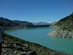 Lac de Cleuson is a reservoir in the municipality of Nendaz, Valais, Switzerland. Its surface area is 0.51 km2 (0.20 sq mi). Water from the reservoir is often pumped into the Grande Dixence Dam's reservoir, Lac des Dix, for use in hydroelectricity production.